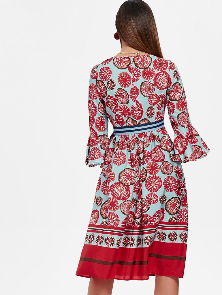 Flare Sleeve Printed Midi A Line Dress