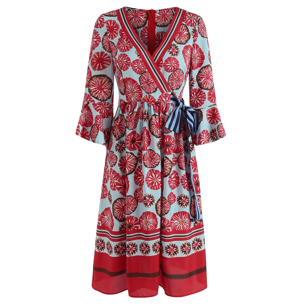 So comfy and pretty, this beautiful knee-length dress features a floral pattern all over, a femme surplice v neck and a flattering high waistline which extends your body proportions, in a trendy A-line silhouette. The tie-front detail and bell sleeves design add charm and glamour.