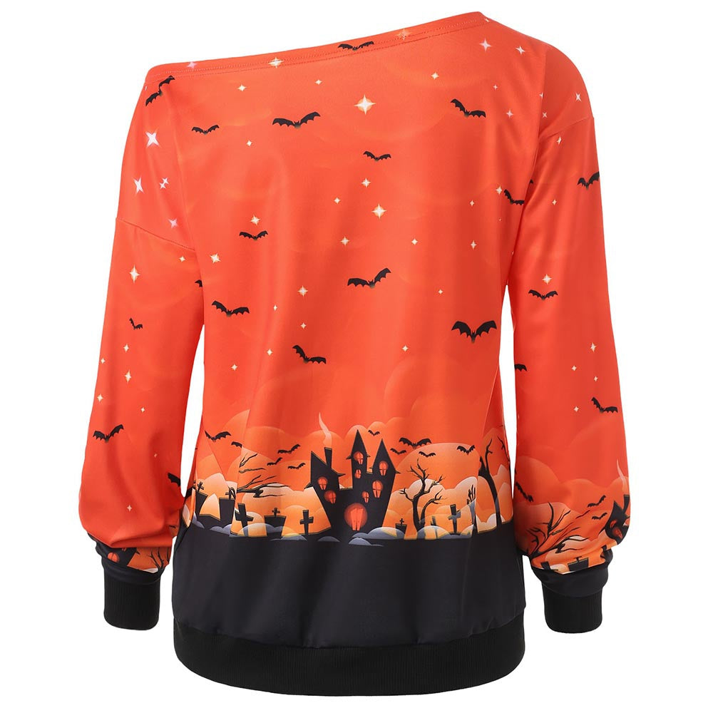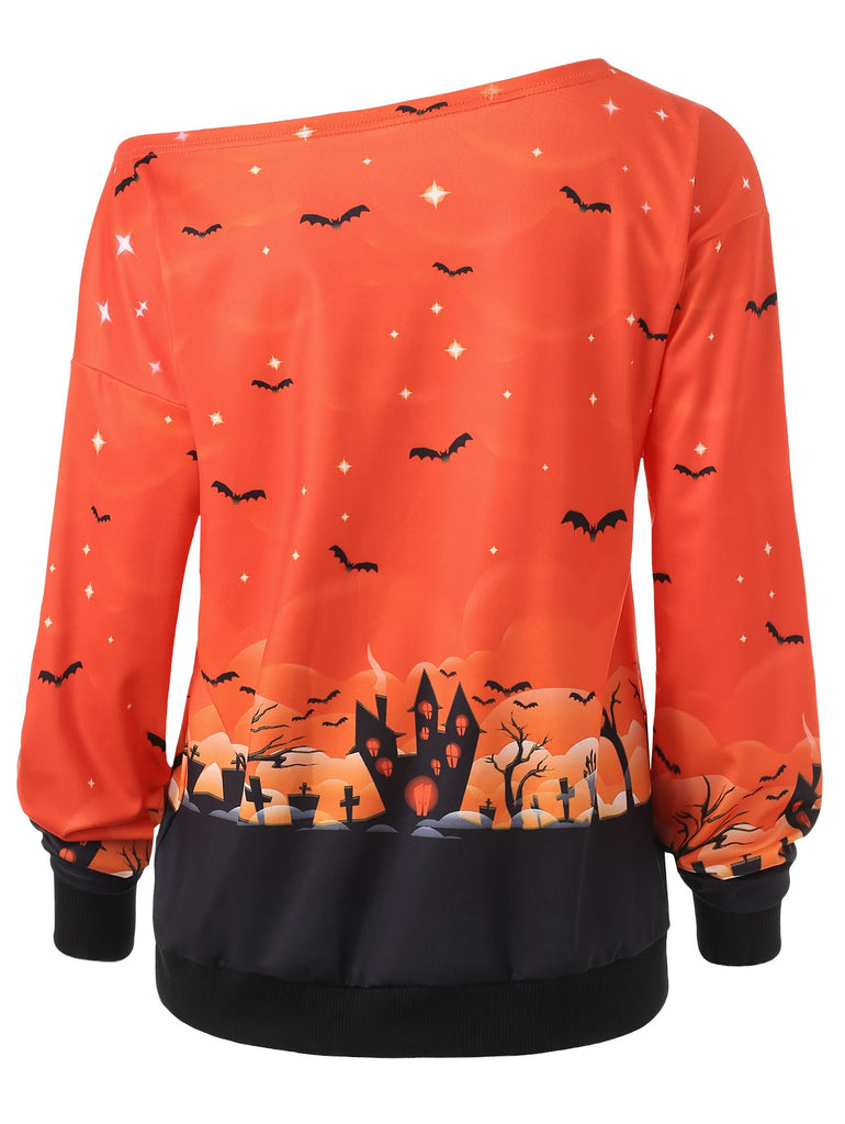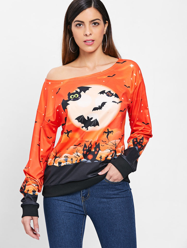 Halloween Bat Print Skew Neck Sweatshirt