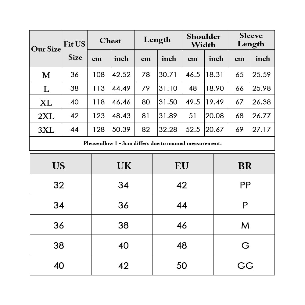 Size  	Chest  	Length  	Shoulder Width  	Sleeve Length