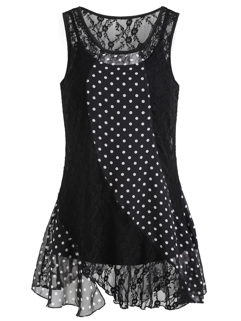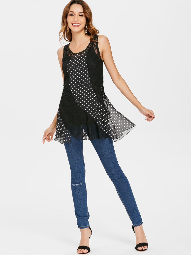 Polka Dot Panel Sleeveless Lace Blouse