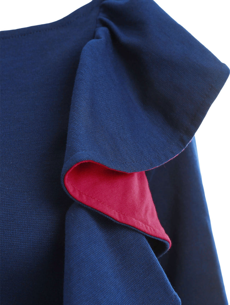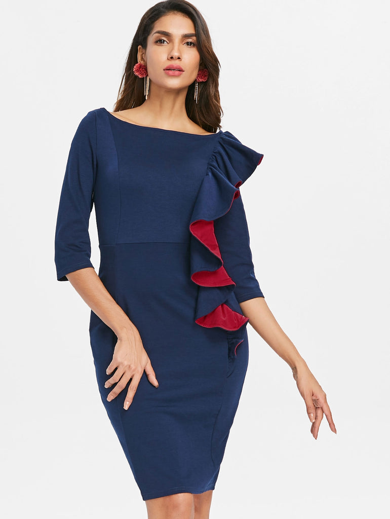A cascading ruffle adds a dramatic punctuation to this figure-skimming bodycon dress which features a classic round neck, 3/4 length sleeves, and a concealed back zip closure. High waist for extending your body proportions.