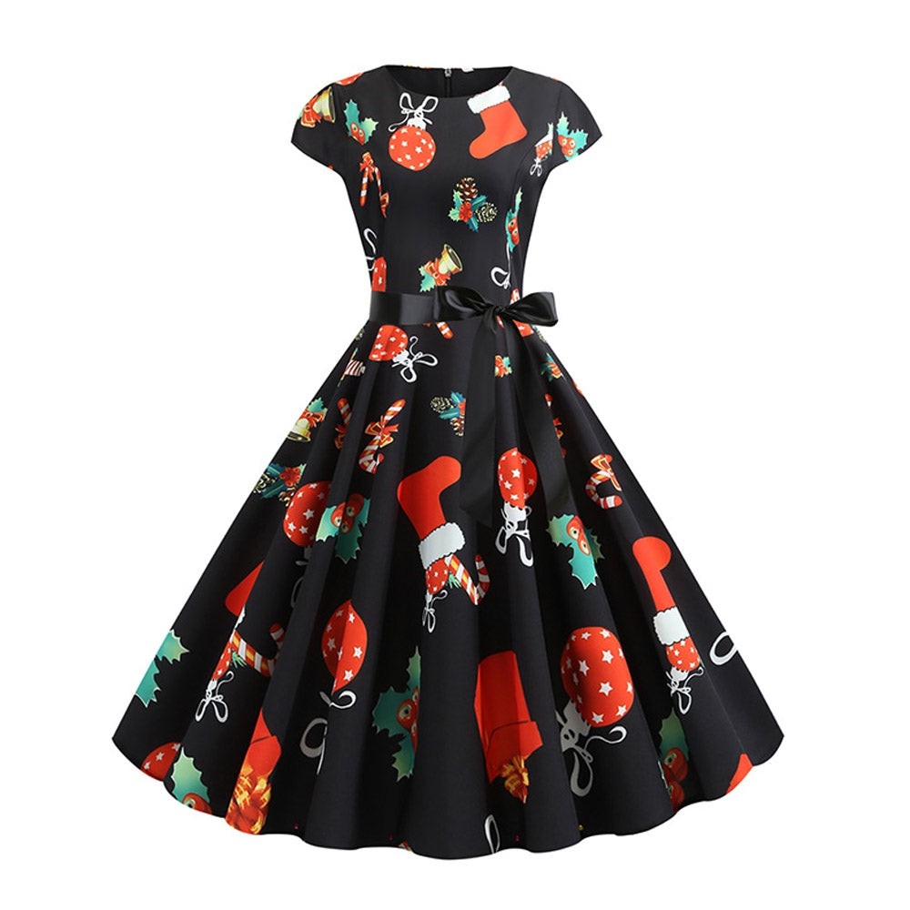 Santa Claus Gifts Cap Sleeves Belted Christmas Dress