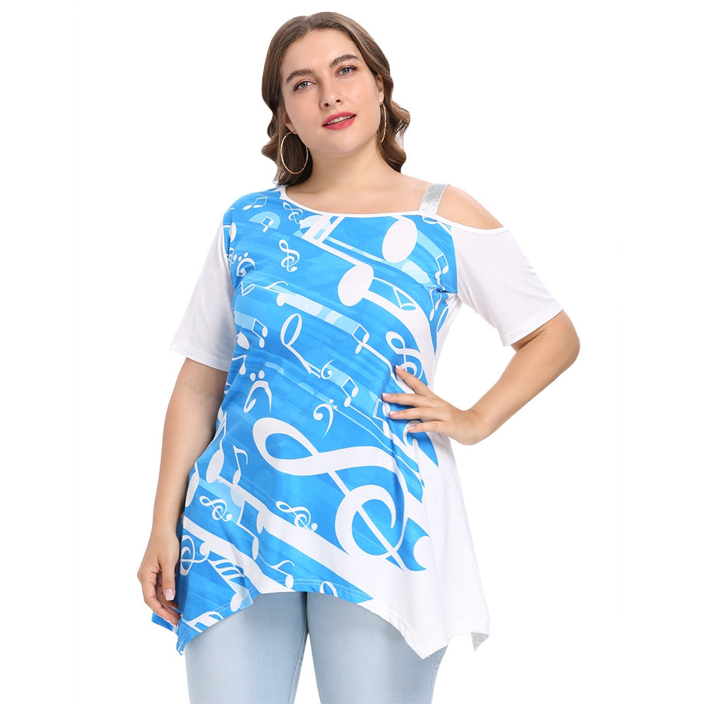 Trendy Skew Collar Short Sleeve Print Plus Size Women T-shirt