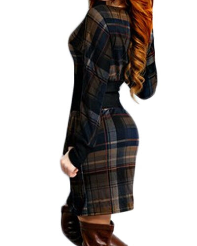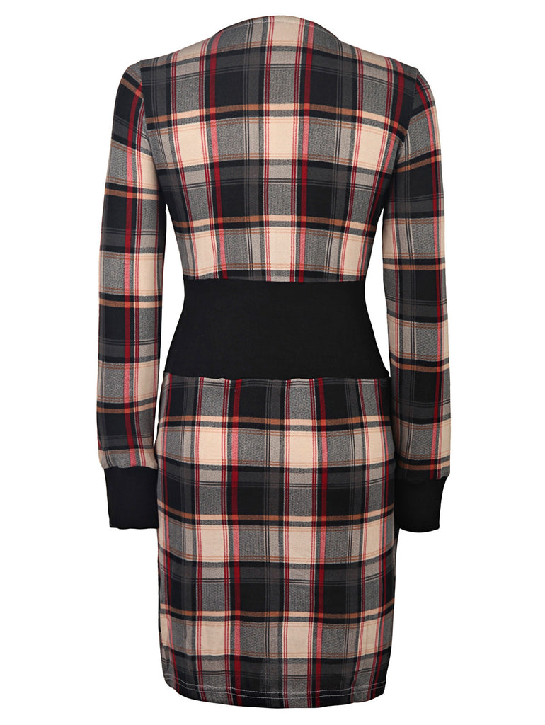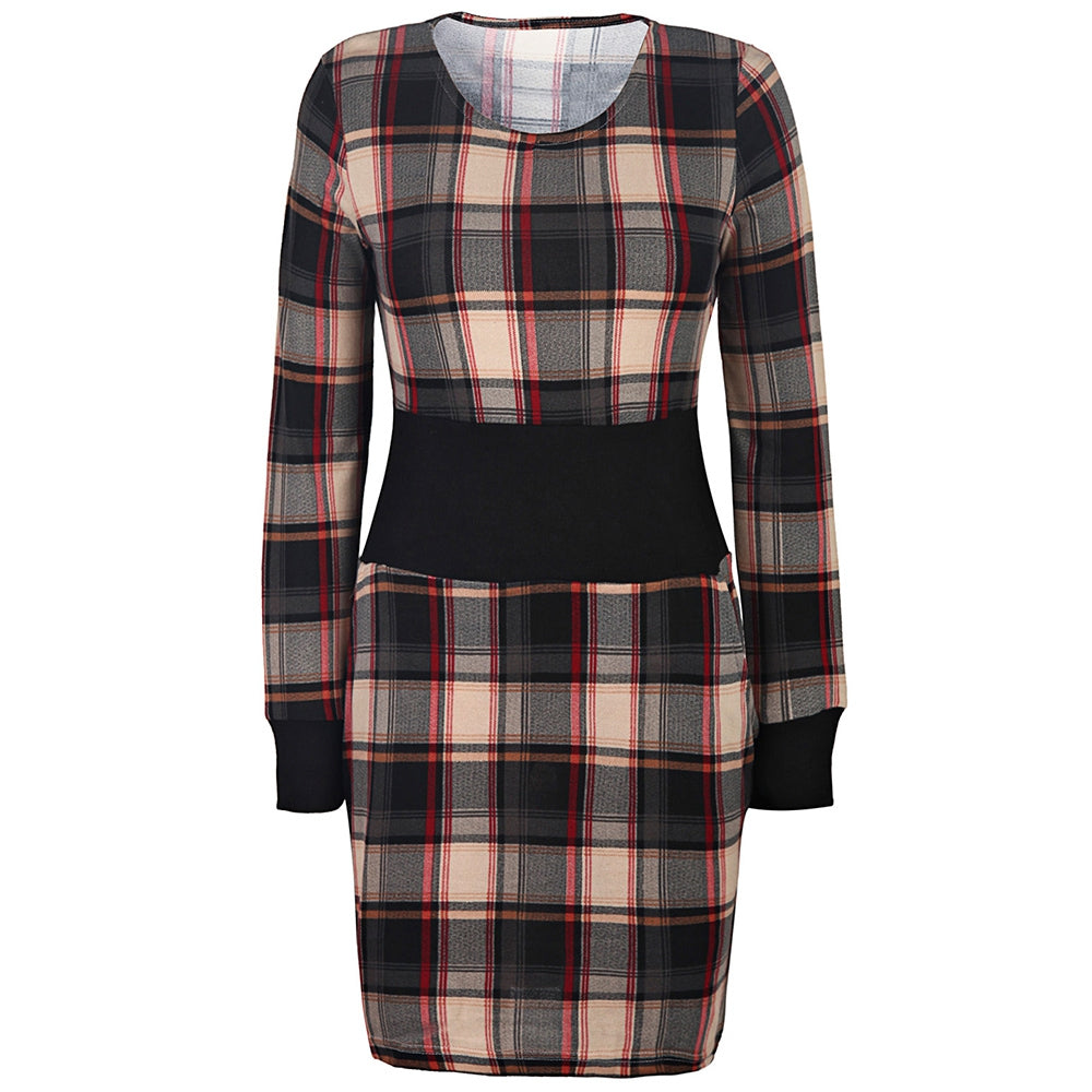 Women Stylish Scoop Neck Long Sleeve Gingham Slimming Dress