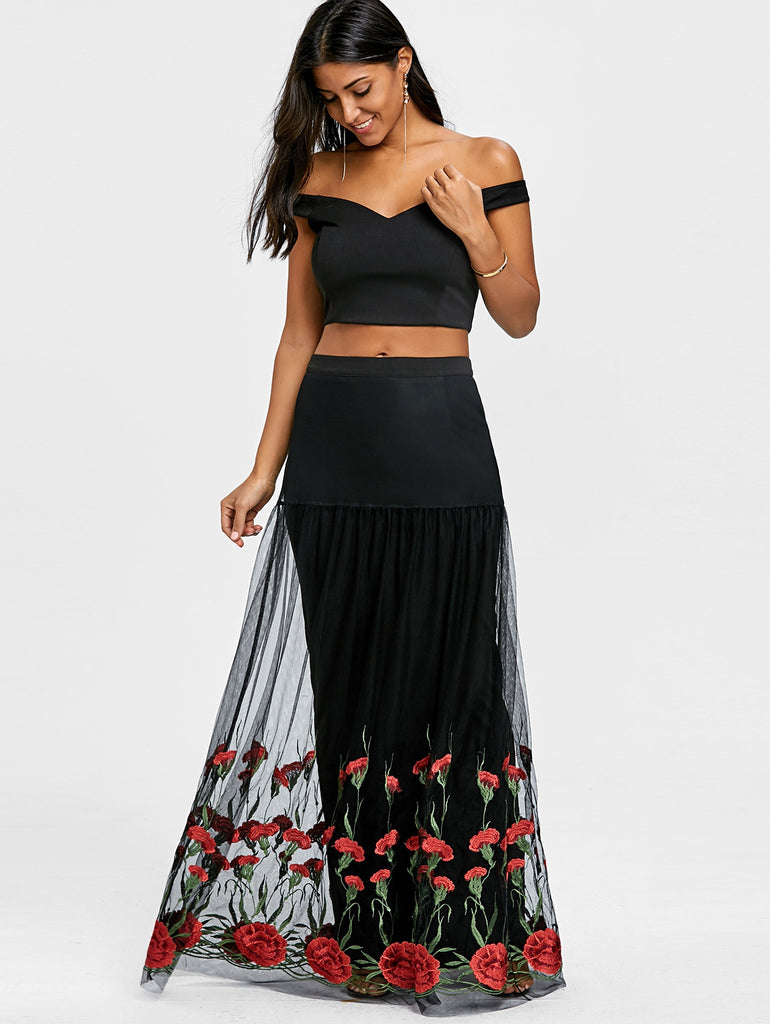 This sweet two-piece dress includes a cold shoulder top and a tulle skirt. The embroidery flower design will make you win more compliments. Terrific outfit for the club, night out, party or other occasions. This is a must-have!