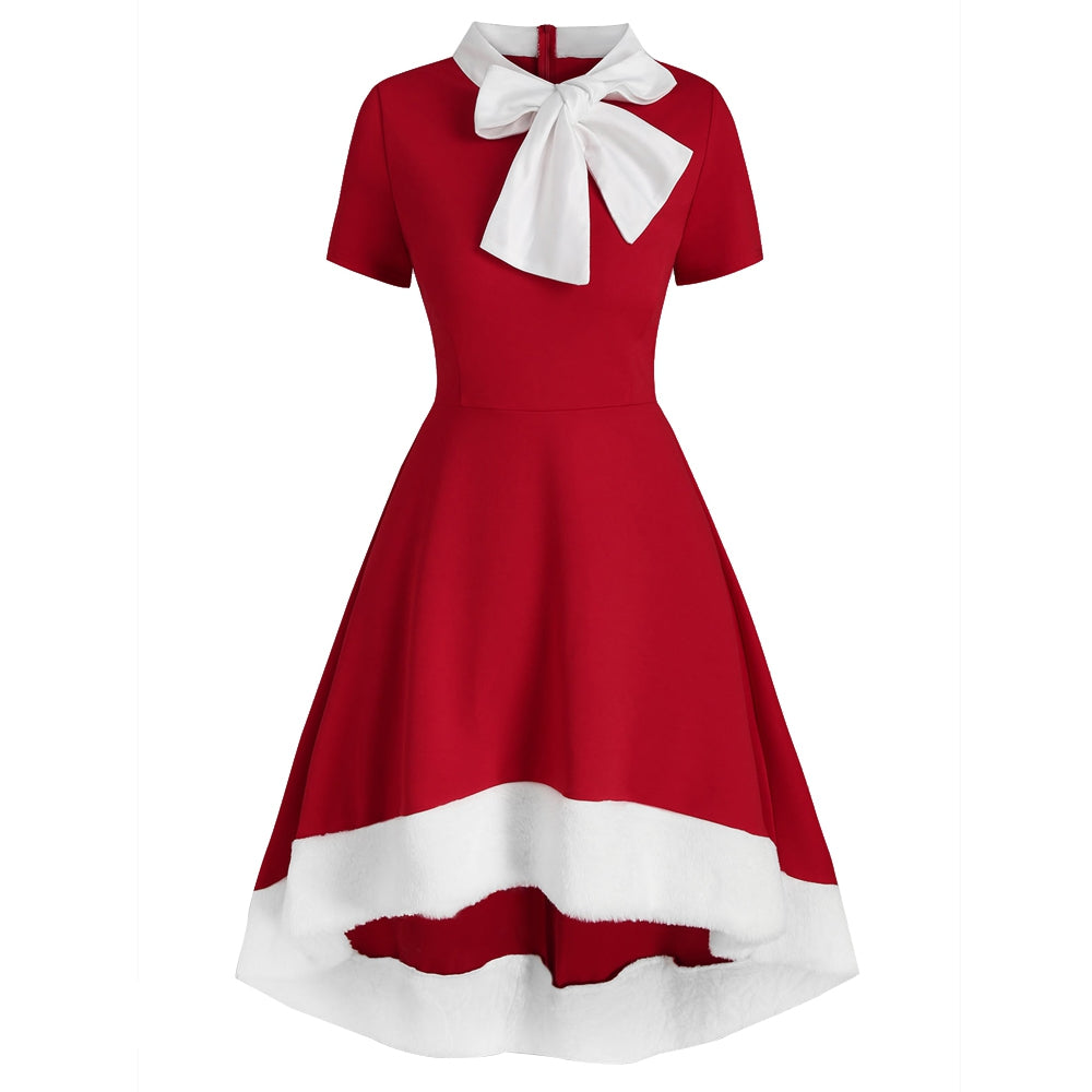 Christmas Bow Tie Collar Faux Fur Panel Dip Hem Dress