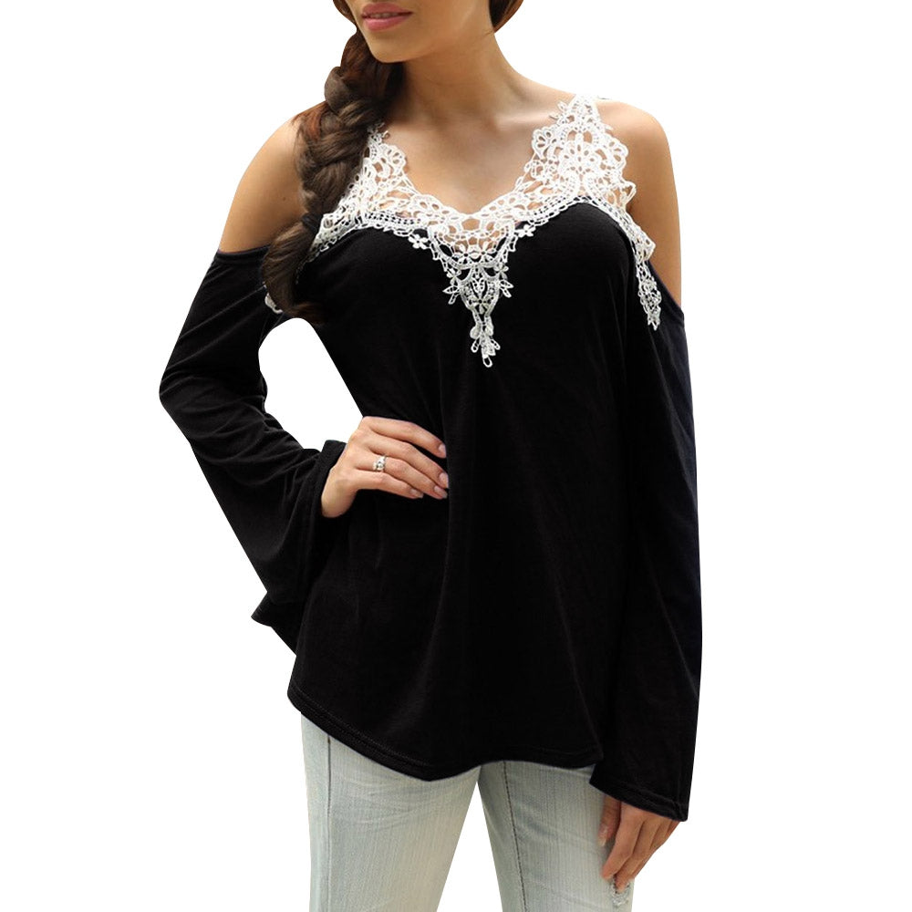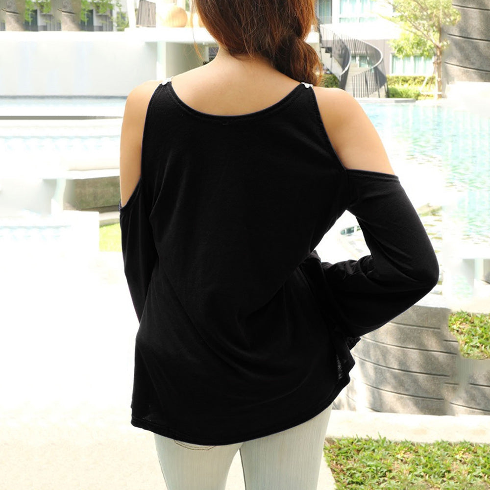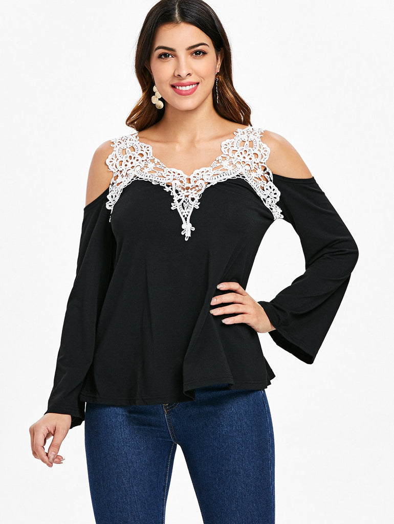 Cold Shoulder Lace Panel Color Block T-Shirt with Long Sleeve