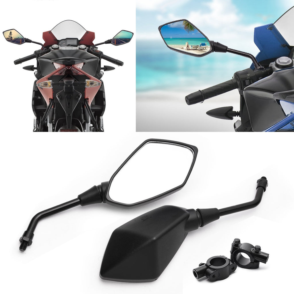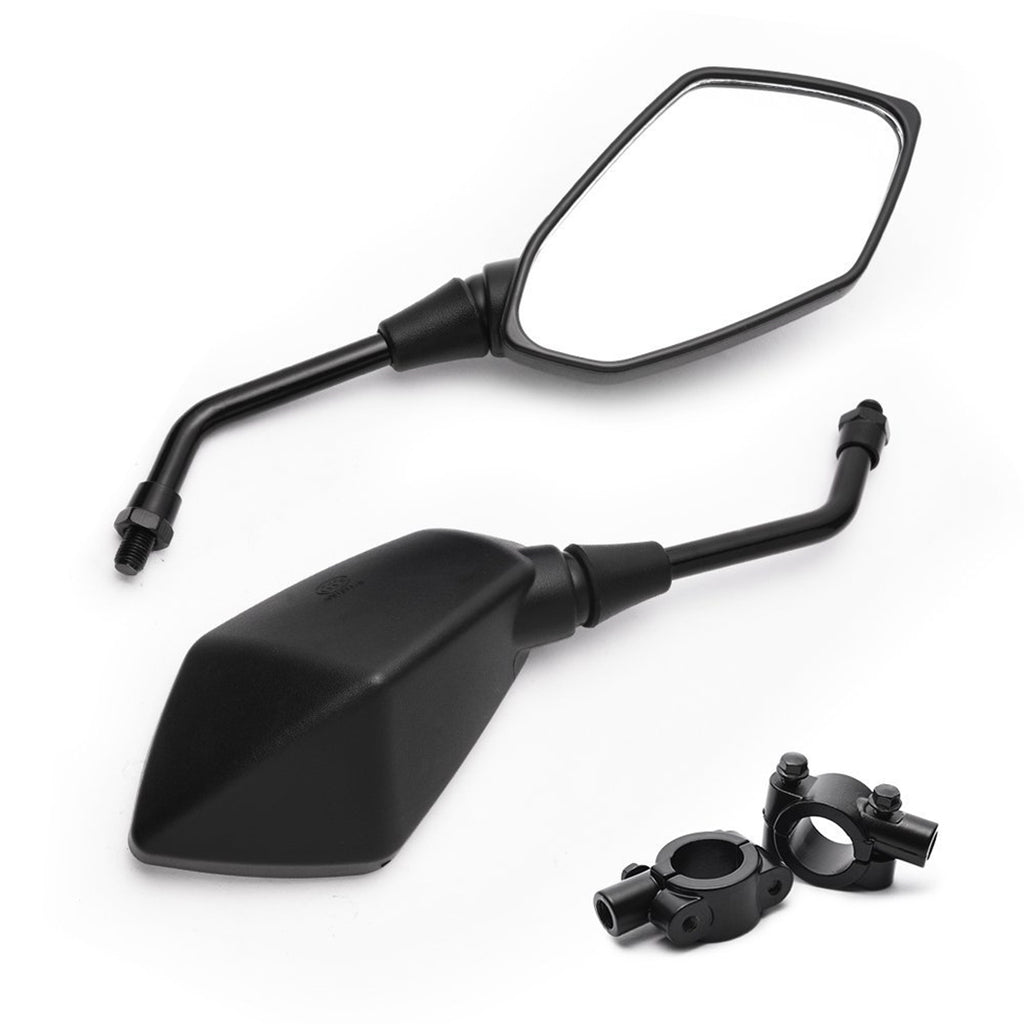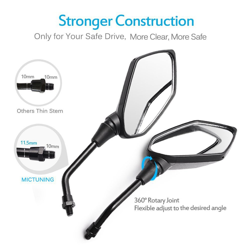 This pair of left and right mirrors is made of high impact ABS shell and sturdy steel stem with 10mm clockwise threaded bolt and 7/8" handlebar clamp, which is solid assembly that widely suitable for most brands of motorcycles, Kawasaki, Suzuki, Honda, Victory, Cruiser Chopper, etc. More importantly, the installation was like a breeze, just screw it up and it is not compromised by wind or vibration during riding.
